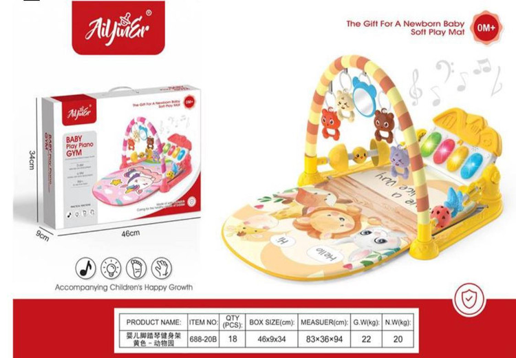 دارای یک عدد پیانو دارای تشک راحت و نرم نیاز به 3 عدد باتری قلمی قابلیت تنظیم صدای موسیقی مناسب برای کودکان 0 الی 36 ماه قابل استفاده بصورت 4 مدل مختلف دارای موسیقی کوتاه و بلند تا 15 دقیقه قابلیت تقویت قوای جسمی توسط پیانو دارای محل آویزان کردن جغجغهها بصورت هلالی بازی بصورت دراز کش، نشسته، درازکش روی شکم و ایستاده ضدحساسیت