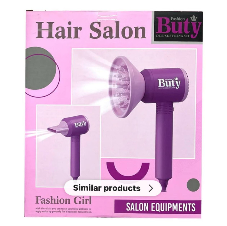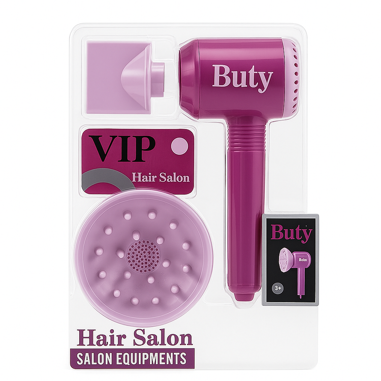 ست آرایشگاه اسباببازی کودک مدل Hair Salon Buty با طراحی صورتی جذاب و بستهبندی VIP، شامل سشوار اسباببازی، سری متمرکزکننده و صفحه پخش باد. مناسب برای بازی نقشآفرینی دخترانه، ساختهشده از پلاستیک مقاوم و ایمن برای کودکان ۳ سال به بالا.