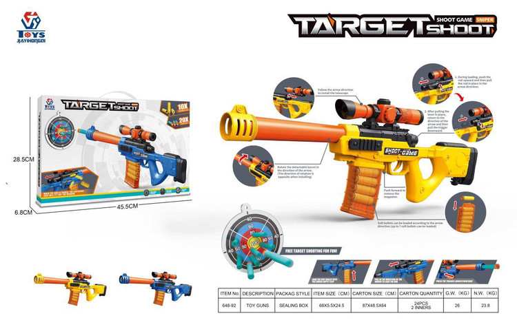 متاسفانه این کالا در حال حاضر موجود نیست. میتوانید از طریق لیست بالای صفحه، از محصولات مشابه این کالا دیدن نمایید.این محصول یک تفنگ اسباببازی به نام "TARGET SHOOT – Shoot Game Sniper" است که برای بازیهای هدفگیری طراحی شده. در ادامه مشخصات کلی آن را میبینی: