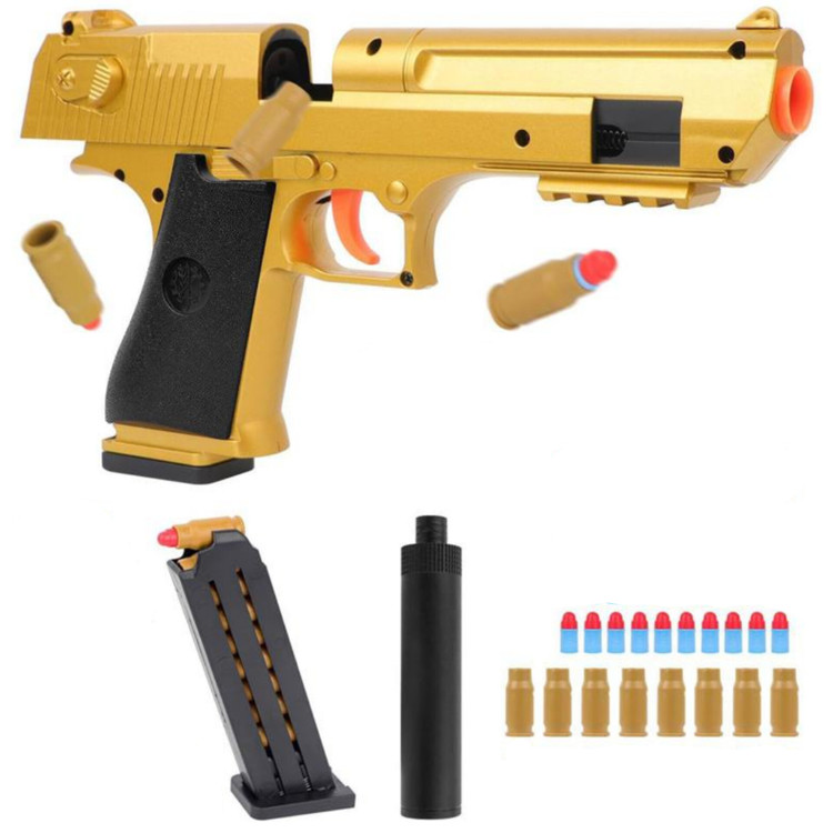تفنگ اسباببازی کلت طلایی پوکهپران یک انتخاب شیک و هیجانانگیز برای علاقهمندان به بازیهای ماجراجویانه است. این مدل با رنگ طلایی متالیک خاص، طراحی الهامگرفته از نمونههای واقعی، و بدنه مقاوم از پلاستیک فشرده ساخته شده است. مجهز به صدا خفهکن (سایلنسر)، خشاب استاندارد، و پوکههای فشنگ با ساچمه نرم که پس از شلیک پرتاب میشوند. لولهی نارنجی آن ایمنی کافی برای بازی کودکان بالای ۸ سال را تضمین میکند.