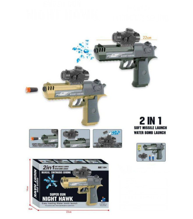 تفنگ بازی ۲ کاره SUPER GUN NIGHT HAWK مدل دستی با شلیک تیر ابری و تیر ژلهای – ۲۲ سانتیمتر