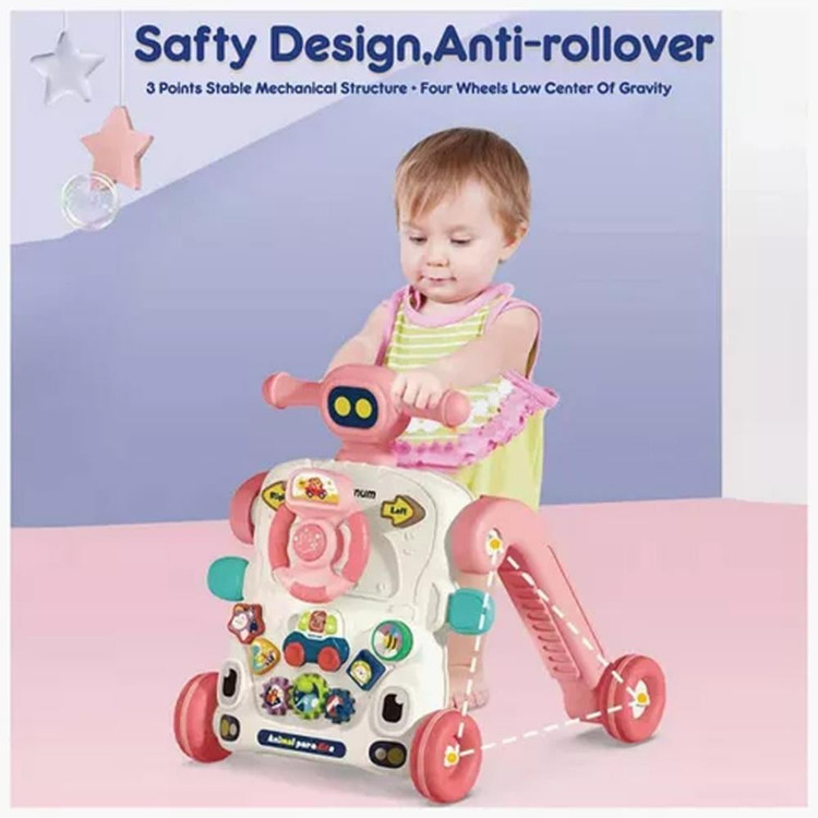 این واکر تنها یک وسیله کمکی برای راه رفتن نیست؛ بلکه یک میز بازی موزیکال و سرگرمی آموزشی نیز محسوب میشود. بخش جلوی واکر دارای اسباببازیهای متنوعی مثل فرمان، دکمههای رنگی، دندههای چرخان و قطعات آموزشی است که توجه کودک را جلب کرده و به رشد ذهنی و تقویت هماهنگی چشم و دست کمک میکند.